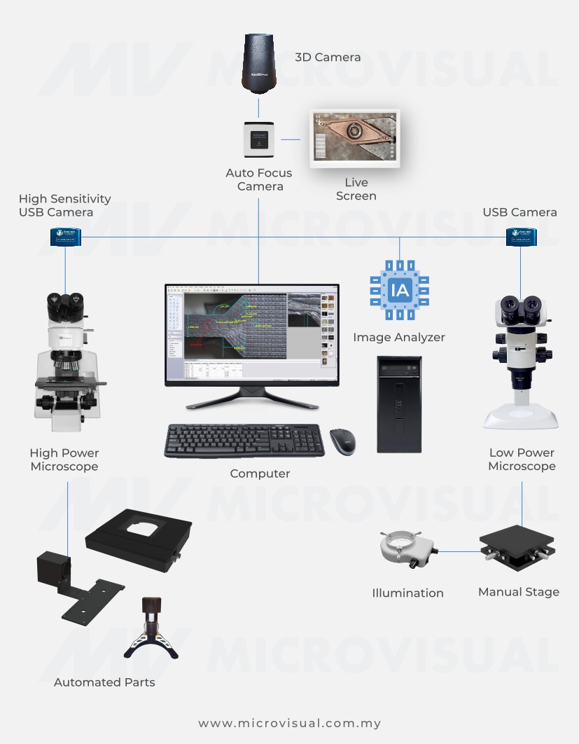 manually can be performed instantaneously with the attachment of digital camera and image analyser. The addition of motorised components enables automated scanning as well as 3D surface profiling capability. MicroVisuals vow to deliver technological advanced microscopy solutions to meet the increasingly demanding and challenging production applications.